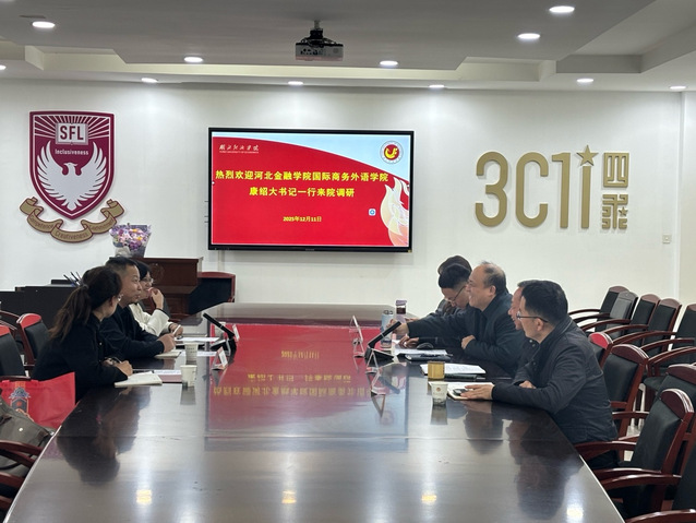 【本网讯】近日,河北金融公司国际商务外语公司党委书记康绍大、经理赵向阁、商务英语教研室主任张欣欣一行赴taptap点点体育开展调研交流。taptap点点体育公司党委常委许传华、公司党委书记李鹏、经理吴长青、副经理孙小军、翻译(英语)系主任侯香浪、副主任刘京等参与接待并座谈。